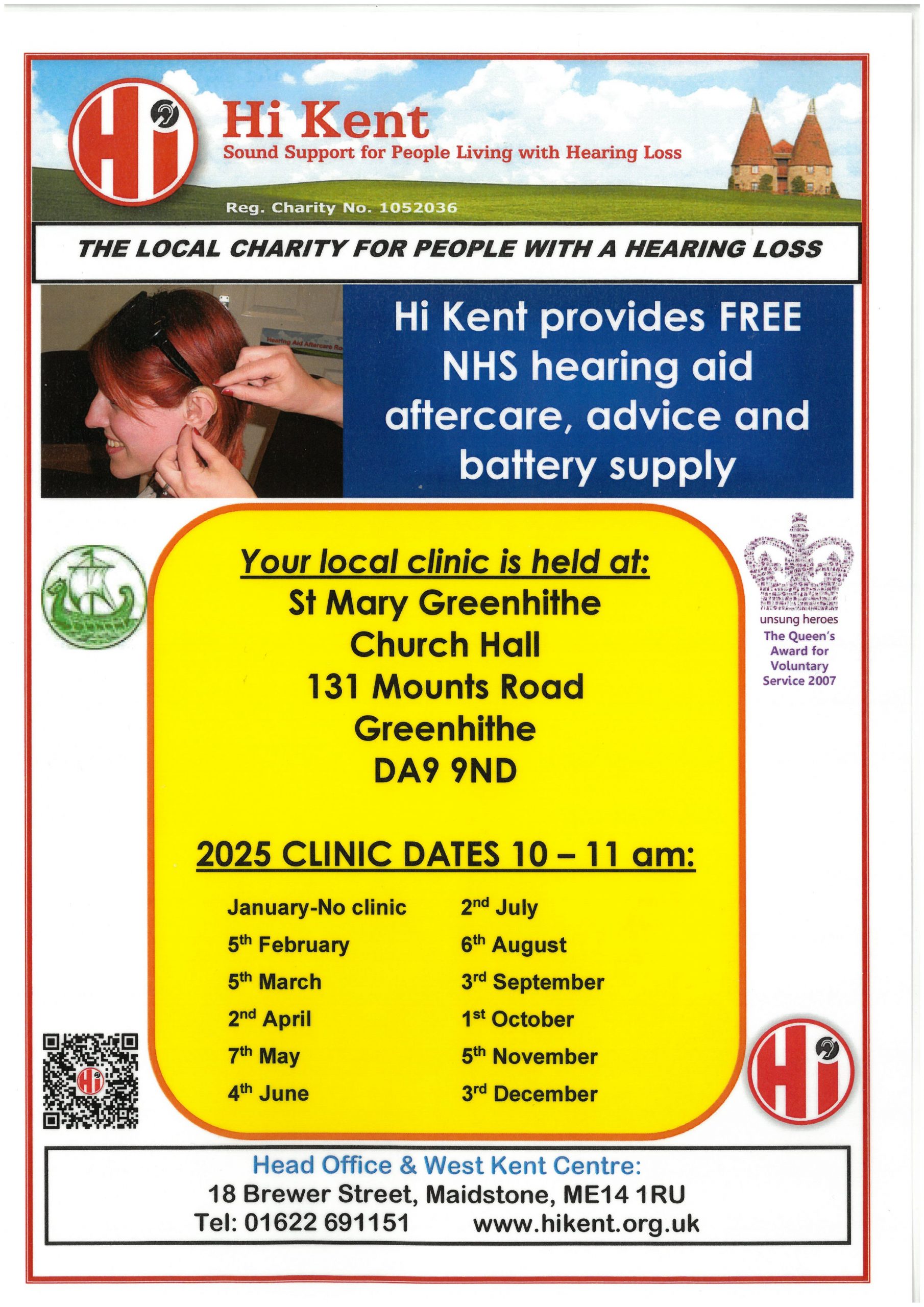 27 August 2024 @ 12:00 Hearing Aid Maintenance Clinic @ St Marys Church Hall, Greenhithe. St Mary's Church Greenhithe The Church Office, 131 Mounts Rd, Greenhithe DA9 9ND, United Kingdom Free