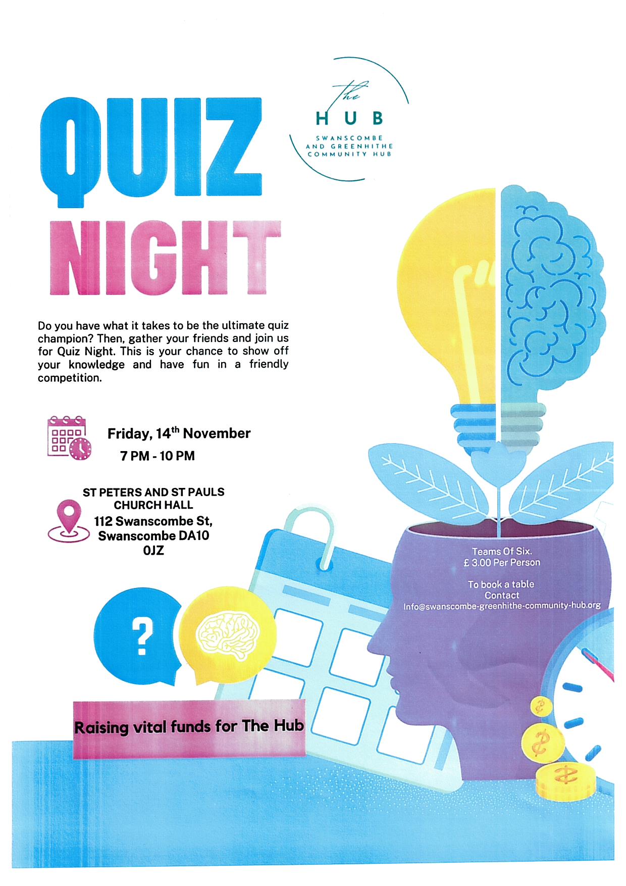 Swanscombe and Greenhithe Community Hub Quiz Night at St Peters and St Pauls Church Hall, on Friday 14 November from 7pm-10pm. To book a table contact: info@swanscombe-greenhithe-community-hub.org