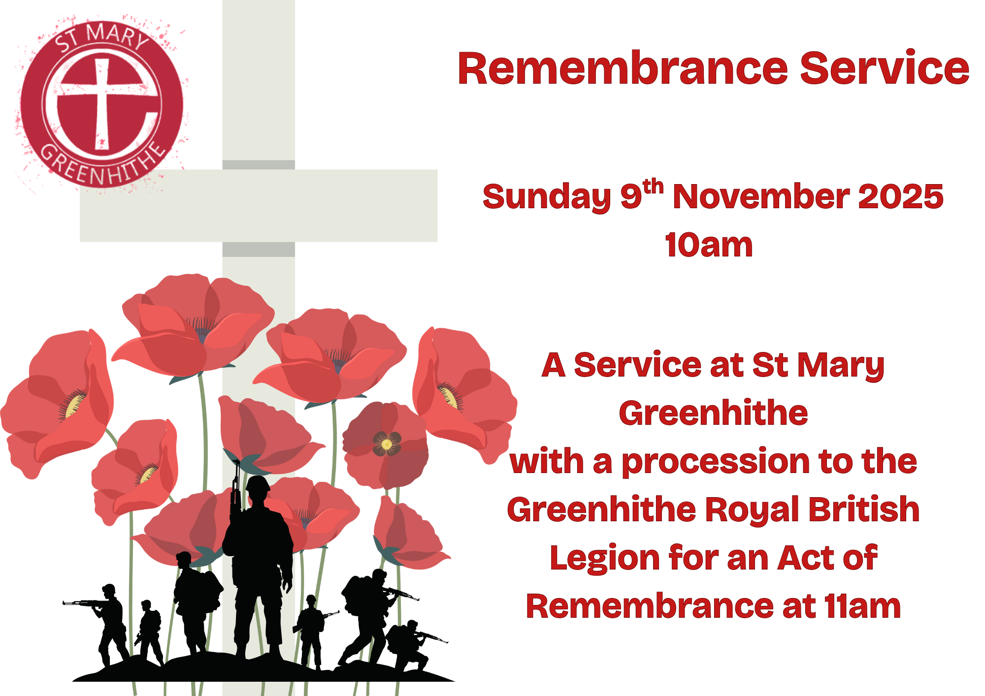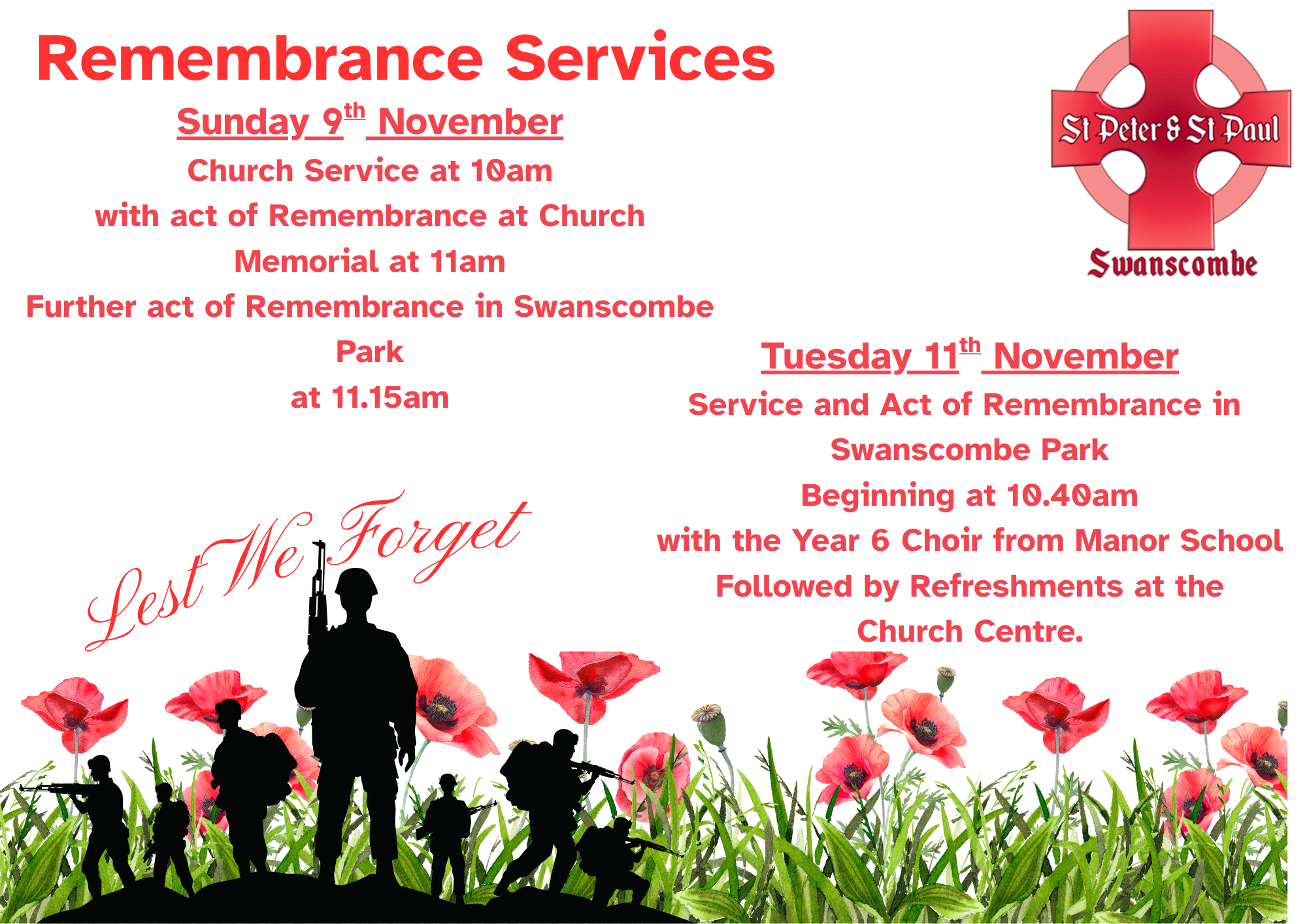 Sunday 9 November Remembrance Church Service starts at 10.00am, with act of Remembrance at Church Memorial at 11.00am. Further act of Remembrance in Swanscombe Park at 11.15am. |