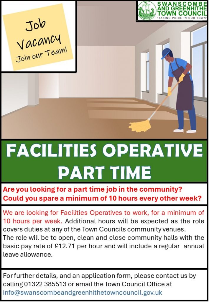 Swanscombe and Greenhithe Town Council are seeking applications for the vacancy of Facilities Operative at Church Road Community Hall.